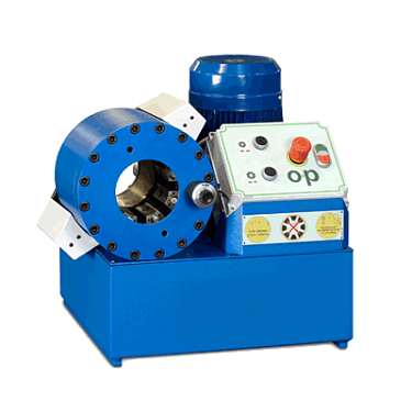 Электрогидравлический привод управляет обжимом матриц, обеспечивая точный контроль диаметра. Удлинённая рабочая зона позволяет легко подавать и фиксировать длинные шланги, улучшая качество и удобство выполнения операций.
